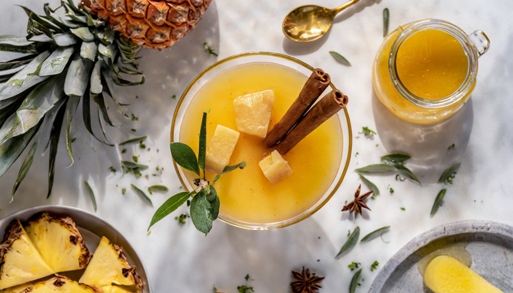 Crafted with a blend of vibrant pineapple juice, subtly sweet heather honey, and an infusion of aromatic cinnamon sticks and bay leaf, this refreshing concoction offers a symphony of taste and aroma. Garnish with fresh pineapple chunks for an extra touch of tropical elegance, or savor it as is for a sophisticated non-alcoholic delight that’s…