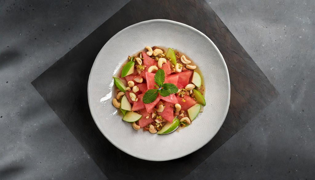 Watermelon Java-Apple Salad with Roasted Cashews, Cardamom and Lime-Mint Vinaigrette